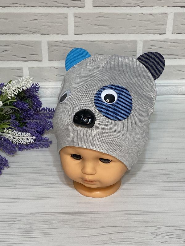 Деми шапуля на малышей. Польский производитель Аnpa. Одинарная вязка. Ушки и и милая мордашка. Состав: 95% хлопок, 5 % эластан Глубина 18см, ширина 19см, тянется до 25см На окружность головы 46-48см