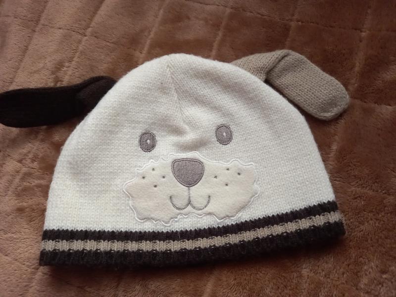 Кумедна шапочка з вушками і мордочкою песика молочного кольору з бежевими та коричневими елементами. Утеплена, підійде на весну/осінь. На окружність голівки 50 см.