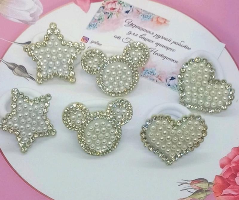 Изготовлена из страз и бусин В среднем 4-5 см в диаметре