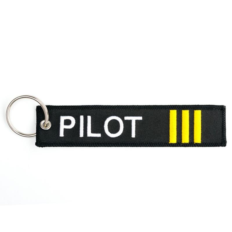 Брелок "Pilot" 3 полосы - стильный аксессуар, подчеркивающий принадлежность владельца к лётному экипажу. Можно использовать как брелок к ключам, также этим брелком можно украсить лобовое стекло автомобиля, также брелок можно прицепить к бегунку молнии на сумке, для удобства её расстёгивания. Если вы ищете авиационный сувенир или презент- выбирайте брелок "Pilot", он 100% понравится получателю. Конструкция: - брелок черного цвета с надписью "Pilot" вышитой белой ниткой и тремя жёлтыми полосками, на металлическом кольце.