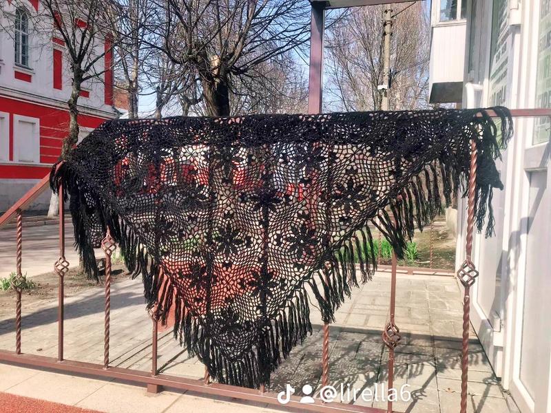Шаль ручноі роботи чорного кольору,зв’язана гачком,нитка -20% мохеру,80% акрілу,розмір 2м 15 см ширина розмаху і 105 см в довжину посередині з китицями(китиці 15 см)