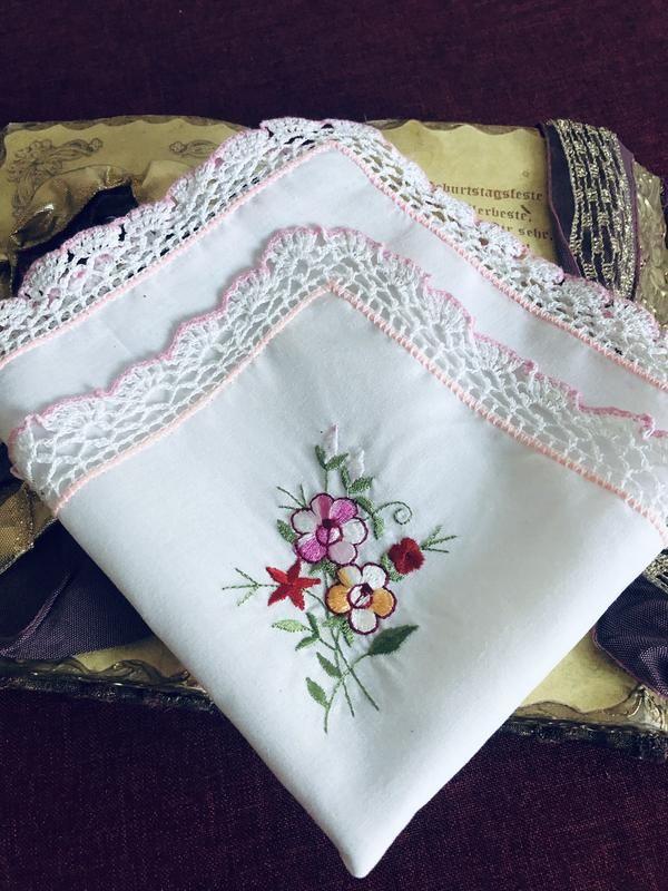 Батистовый белый платочек с вышивкой гладью и ручным кружевом крючком -розово белым Ращмер 31х31 мм