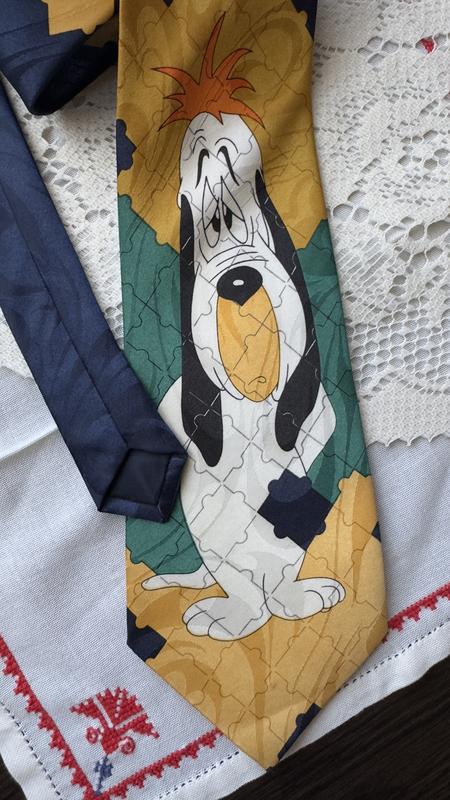 Персонаж: Друпі (Droopy), відомий персонаж мультфільмів студії Metro-Goldwyn-Mayer. • Стиль: Краватка має яскравий дизайн із зображенням Друпі на тлі геометричного візерунка, що нагадує пазл або ромби. • Матеріал: виготовлена з шовку. • Призначення: Таку краватку можна носити для створення неформального або грайливого образу, або як колекційний предмет для шанувальників мультфільмів.