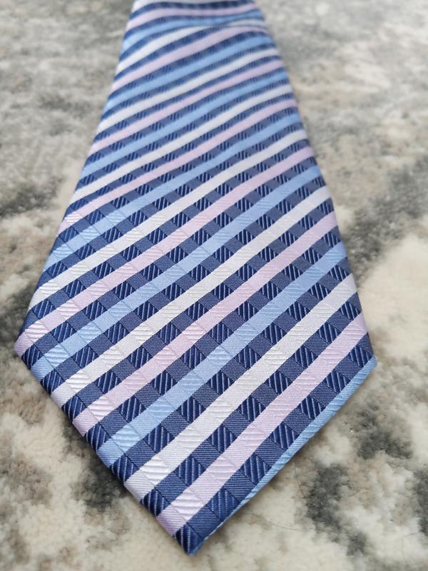 Галстук Next полосатая клетка,ткань заявлена как шёлк( тактильно ощущается добавка полиэстера и он практически не мнётся)рельеф ткани структурный,имеется матовый блеск на светлых участках средней глянцевости. Ширина 9см,длина 147см, закрепки верх/низ присутствуют,петелька имеется, конструкция 3х слойная. Состояние отличное