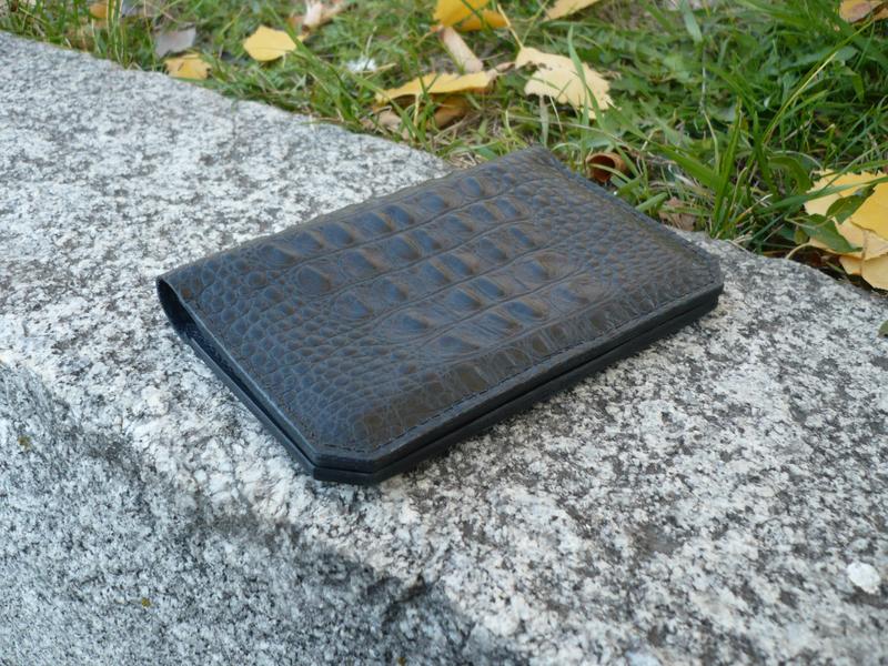Портмоне з комбінованої шкіри у темно синьому кольорі. Зовнішня частина: шкіра ВРХ з тисненням "Бебі крокодил" виробництво Туреччини; внутрішня частина: шкіра ВРХ "crazy horse" . 3 відділення та 3 кишені для карт . Портмоне прошите вощеною ниткою 0,45 мм. Уріз оброблений засобом tokonole (Японія). Розмір: 105*150 мм. Ручна робота. Цінність: 700 грн.