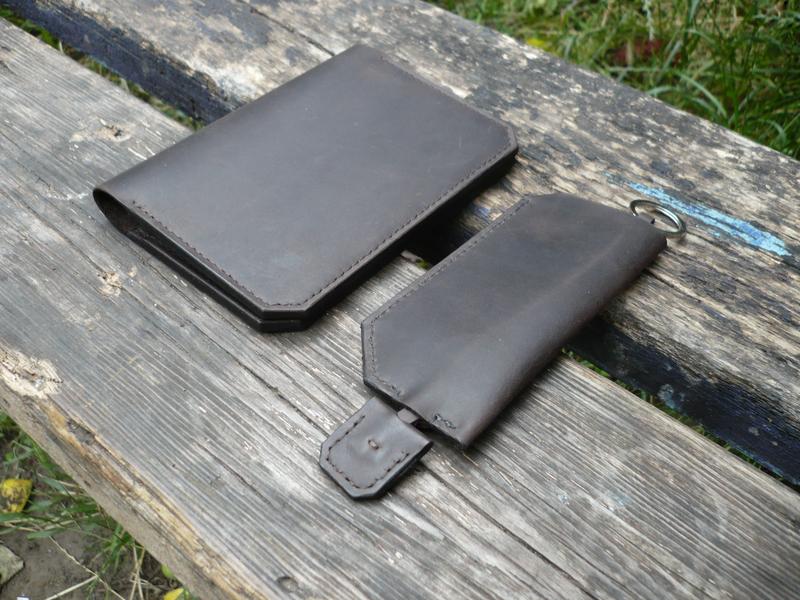 Комплект: портмоне для документів та ключниця. Шкіра ВРХ "crazy horse", колір темно коричневий. Прошитий вощеною ниткою galaces 0,45 мм. Фінішне покриття – крем IEXI wren's dubbin. Ручна робота. Портмоне: 3 відділення та 3 кишені для карток. Розмір 105*150 мм. Ключниця. Розмір 130 мм*55 мм. Є хлястик з кільцем, куди надягають ключі. Цінність: 950 грн