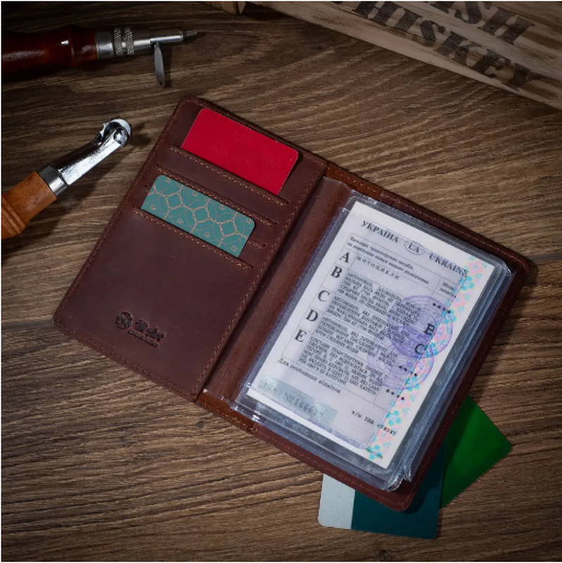 Тип аксесуара: Інший тип аксесуару Кілька примірників у наявності Шкіряна обкладинка-органайзер коньячного кольору для різного виду документів: 1 відділення для паспорта 1 кишеня з пластиковим вікном для водійських посвідчень старого зразка 1 відкидний кишеня з пластиковим вікном для біометричного паспорта / свідоцтва про реєстрацію / страховки 4 секції для карт. Кожна вміщує до 5 карт Укомплектованість додатковим ПВХ вкладишів для Довіреності та інших документів.