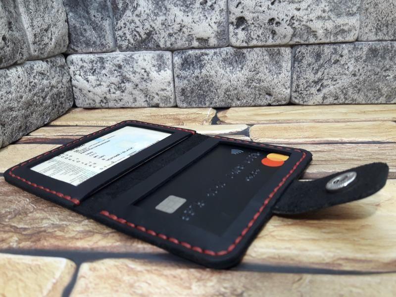 Обложка кожаная для id документов. Черная кожа crazy horse толщиной 1,4-1,6 мм прошита красной строчкой 1 мм вощеной нитью. Внутри обложки 2 отдела окошка для таких документов как паспорт, водительское удостоверение, техпаспорт на авто. Закрывается на кнопку, которая находится на хлястике. Холдер очень компактный и удобный. Размер в закрытом виде 9,5 см*7 см