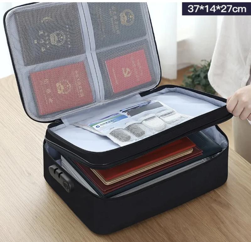 Кодовый органайзер для документов с отделениями Внутреннее пространство сумки с откидными секциями, куда помещаются: паспорта, удостоверения; накопители памяти; чеки, выписки; органайзеры; банковские карты. Для каждой вещи найдется карманчик. Главный отсек предназначен для размещения папок, ценных бумаг, в частности формата А4. Закрывается органайзер для документов на кодовом замке (цифровой 3-значный пароль), сохраняя конфиденциальность и безопасность личного имущества. Кроме прочего, сумка: эргономичная, с округлыми боковинами; с ручкой для ношения в руке; на замке-молнии; из водонепроницаемого материала; с ремнем на задней стенке для крепления к ручке дорожного чемодана. Размер: 38*27*15с