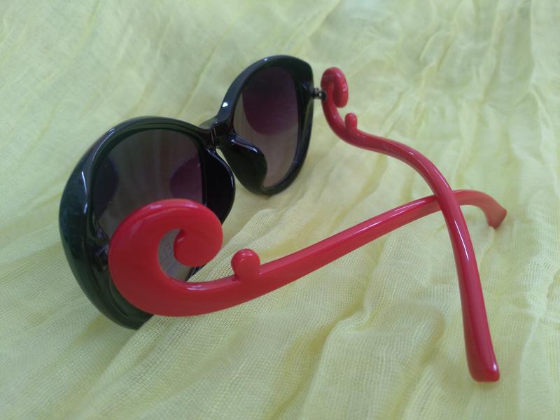 Солнцезащитные очки черного цвета с красной ажурной дужкой. 400 защиты от ультрафиолета. Пластик.