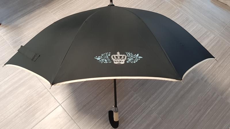 Продам зонт-трость. Полуавтомат. Высота зонта 85 см, ширина в раскрытом виде - 100 см. Спицы железные, трость- пластик. Зонт новый, но немного потемневшая светлая полоса на ручке, на фото видно