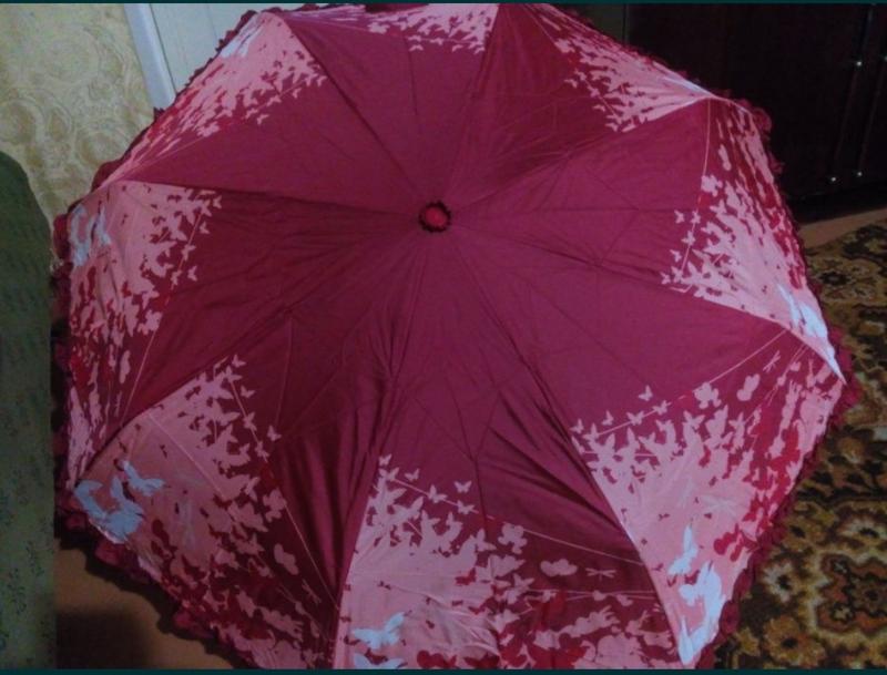 зонт складной новый с рисунком бабочки - очень яркий - абсолютно новый, не использовался - цвет яркий - по краям зонтика рюши - очень симпатичный зонтик с летним рисунком бабочки. размеры: в раскрытом виде - 110 см, в сложенном - 24 см. очень удобный, легко помещается в дамскую сумочку. Открывается вручную,неавтомат, легко раскрывается и закрывается. оплата на карту, новая почта, укрпочта.
