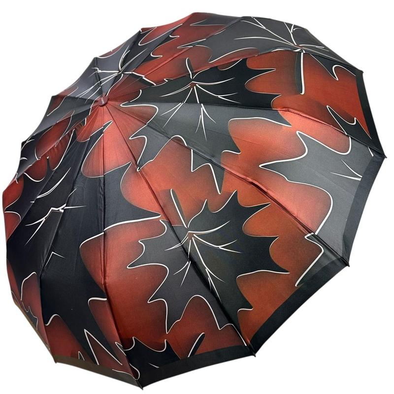 Женский зонт-автомат на 14+3+2 сегментных карбоновых спиц, купол из сатина с принтом листь...