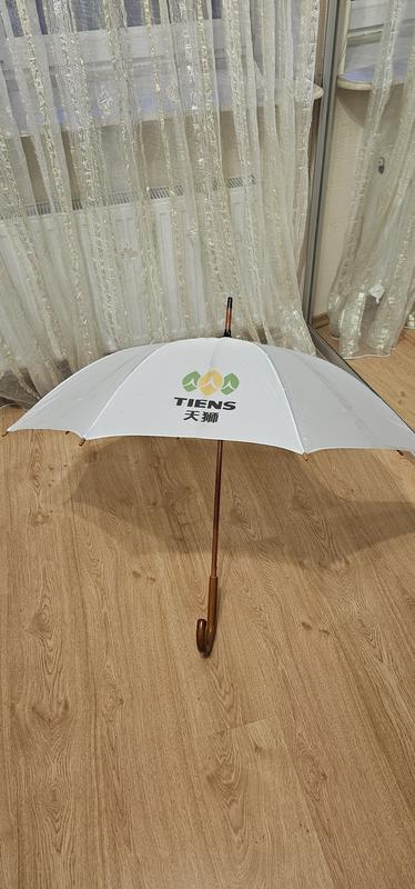 Зонт-трость бренда Tiens. Белого цвета, работает идеально, большие потертости на ручке (на фото видно). Подойдет и на жару, и на дождь. Возвращение есть.