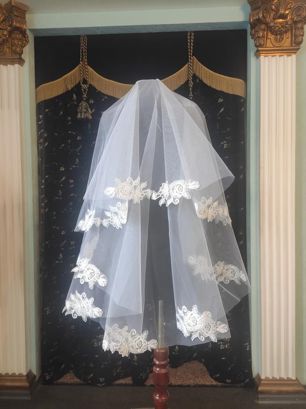 Белоснежная фата с кружевной эксклюзивной отделкой по краю.