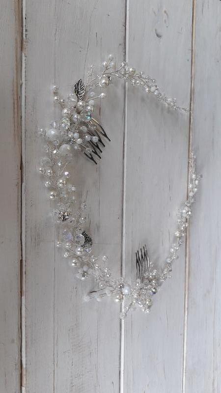 Гілочка в булому виконанні і молочному. Матеріали: стрази,велірний пострібнений дріт, кришталеві намистини, чешський бісер. До повного комплекту можу запропонувати сережки чи браслет.