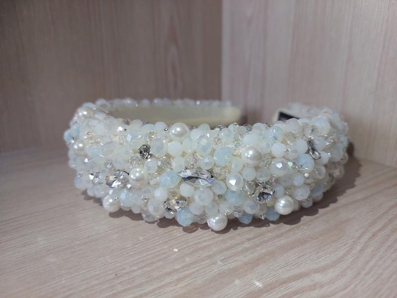 Шикарный обруч, вышитый разнообразными хрусталиками и стразами, а также жемчужинками. Пришито качественно.