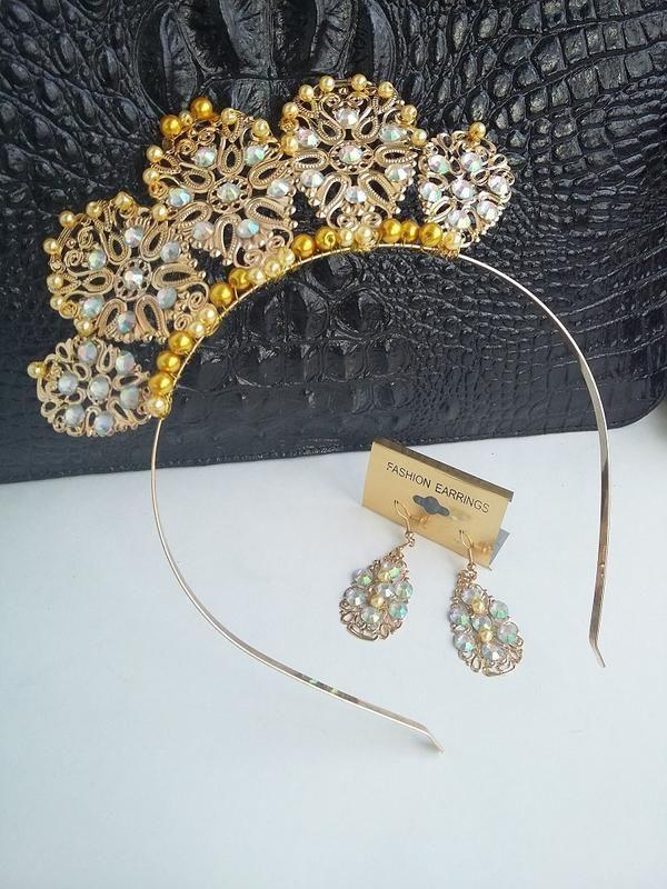 Красивый аксессуар для любого праздника, фото сессий и просто хорошего настроения. высота 6,5см, обруч золотой Ручная работа - всегда эксклюзивная и в единственном экземпляре! Обруч тиара выполнена из проволоки, бусин разного диаметра и цвета, хрустальных, жемчужных бусин. Мои работы сделаны с любовью и максимально аккуратно, надеюсь и вам понравится!