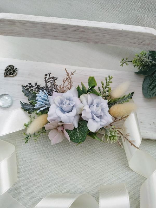 Бутоньерка на руку с голубыми розами и лагурусом