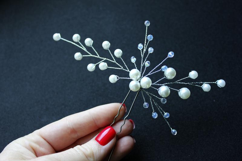 Сдержанное и изысканное украшение для волос. Ручная работа. Заколка выполнена из металлической основы, ювелирной проволоки и бусин. Отлично принимает нужную форму прически