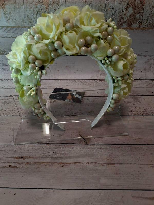 Свадебный венчик из объемных цветов, которые прикреплены к пластмассовому обручу и обработан лентой. Возможно индивидуальное исполнение в нужных цветах✨️
