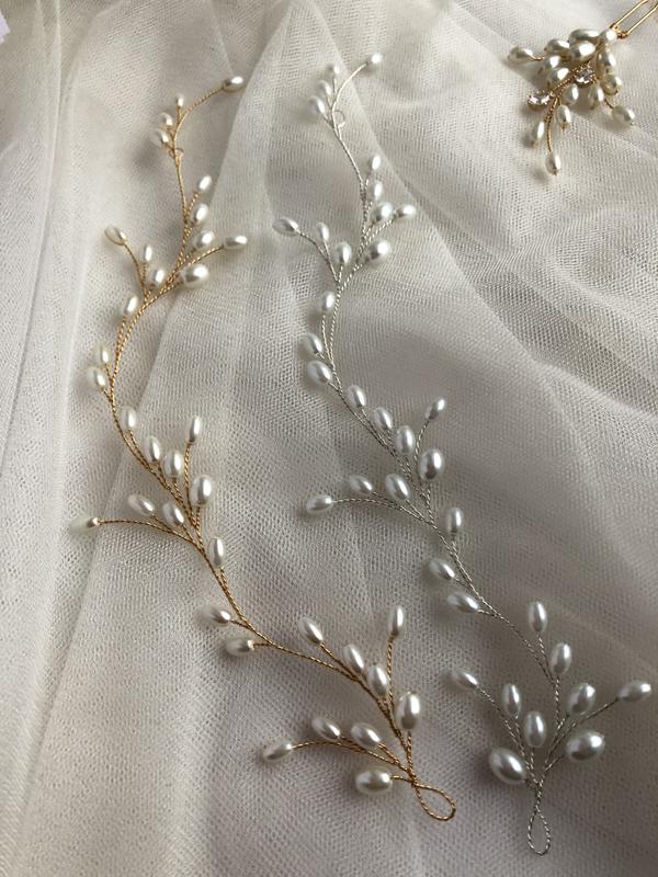 На фото две веточки, одна сплетена золотистым дротиком из молочных жемчужин, другой посеребренным из белых жемчужин. Длина около 22 см. Если нужна другая длина пишите. При заказе вказывайте какую вам золотистую или серебристую. В комплекте можно заказать серьги, браслет или колье.