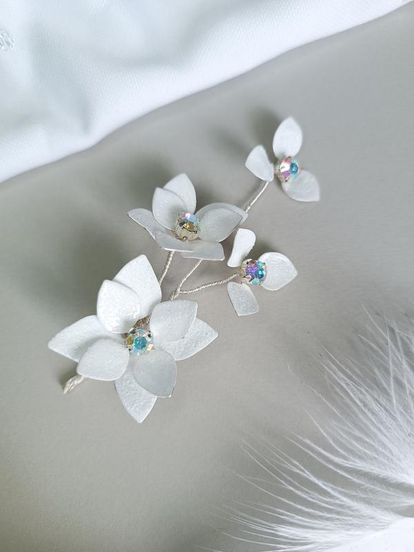 Веточка в свадебное или праздничное прическу. Ручная работа. Выполнена из ювелирной смолы и качественной нетемной проволоки. Длина 10 см. Возможно выполнение другой формы, цвета, с позолоченной проволокой и добавлением бусин.