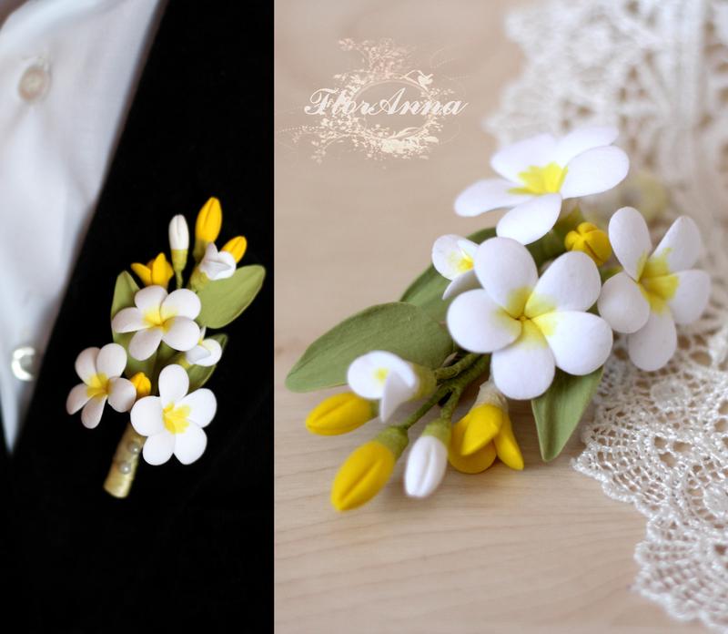 Бутоньерка ручной работы "Плюмерии с листиками" станет ярким акцентом в свадебном образе жениха или свидетеля. Только для стильной свадьбы) Каждый цветочек слеплен вручную из самоотвердевающей полимерной глины decoclay. - Основа бутоньерки: булавка Авторский дизайн и качественные материалы. Наши цветы не вянут и выглядят всегда безупречно. Под бутоньерку возможны украшения: - браслет - заколка -серьги Цветы можно сделать в любом цвете Оформляем заказ "КУПИТЬ" и в комментариях к заказу указываем цвет. Пример: Цветок:пион белый,чашелистики зеленый (2), фрезии желтый 3