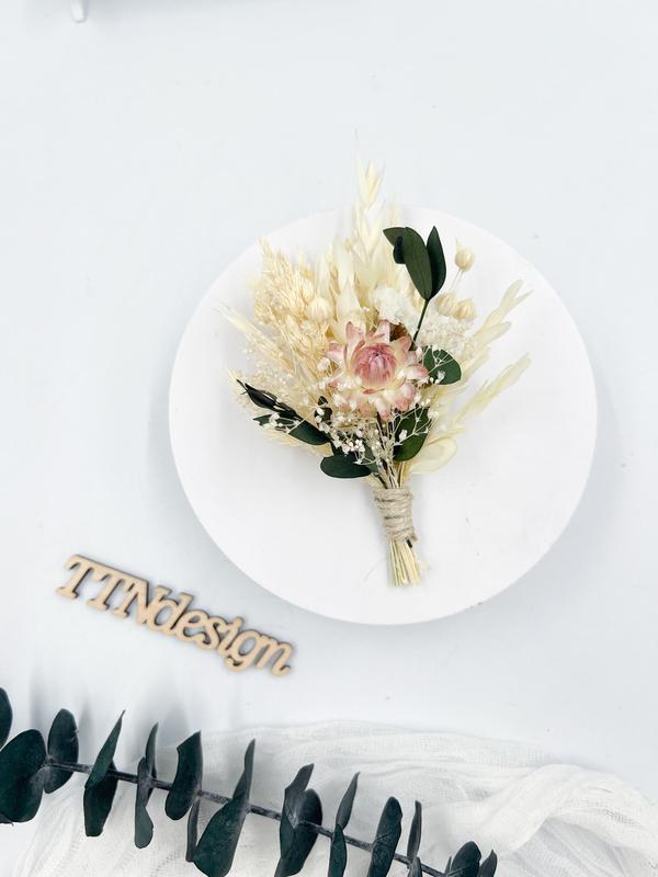 Ніжна бутоньєрка ручної роботи зі стабілізованого евкаліпта та сухоцвітів у витончених рожевих і айворі тонах. Ідеально підходить для нареченого, дружбів або як стильний аксесуар для особливих подій. Завдяки використанню стабілізованих та сухих квітів, бутоньєрка довговічна, не в'яне і зберігає свою красу протягом довгого часу. Ця бутоньєрка чудово доповнить весільний образ у стилях бохо, рустік або вінтаж. Легка, зручна у носінні та кріпиться за допомогою шпильки або стрічки. 🔹 Матеріали: сухоцвіти, стабілізований евкаліпт, декоративні елементи 🔹 Колірна гама: ніжний рожевий, айворі, пастельні відтінки 🔹 Ідеально для: весілля, фотосесій, святкових заходів Додайте унікальності своєму образу - замовляйте вже зараз!