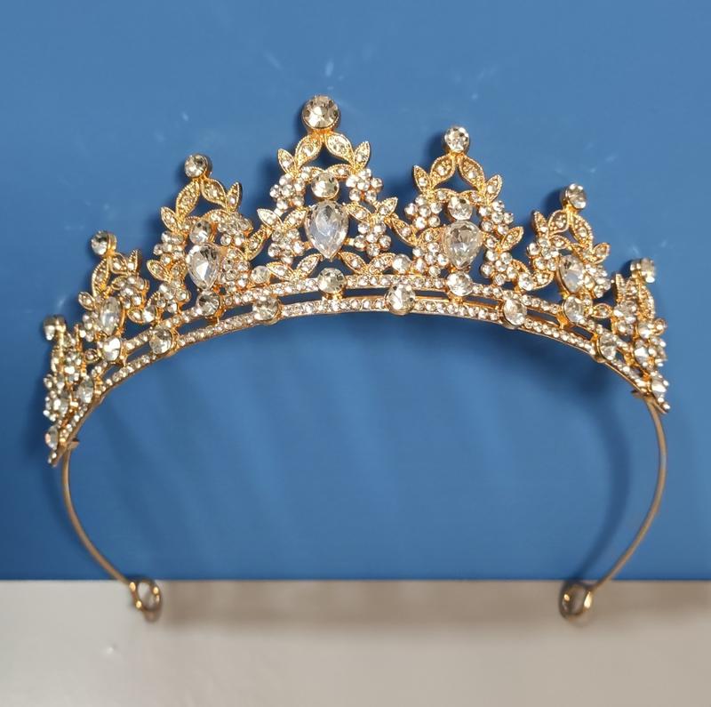 Красивое детское или возможно и для взрослой девочки украшение, корона (тиара) золотистого цвета, с прозрачными камешками. Украшение новенького, красивого качества, изготовлено из металла, камушки красиво сверкают. Аксессуар станет хорошим дополнением новогоднего или свадебного образа.