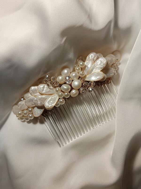 Гребень "Речное сияние" Окунитесь в мир изысканности с этим роскошным гребнем, идеально созданным для невесты, ценящей классическую элегантность. Изящный дизайн, напоминающий нежную веточку, украшенный перламутровыми лепестками ручной работы, напоминающими невесомое сияние, и инкрустированный настоящими речными жемчужинами, что символизируют чистоту и вечную любовь. Хрустальные бусинки придают непревзойденный блеск, ловя каждый луч света и превращая вашу прическу в настоящий шедевр. Этот аксессуар не просто украшение, а семейная реликвия, которая придаст вашему свадебному образу неповторимый шарм и нежность.