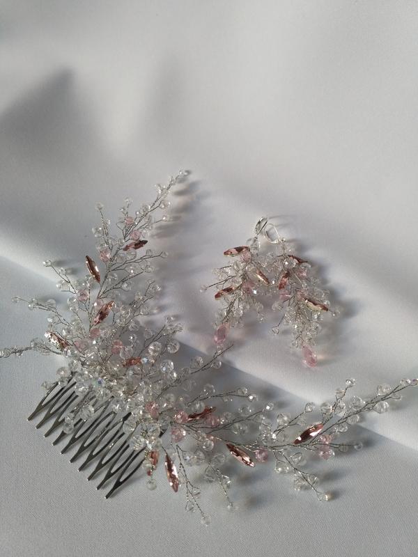 Нежный комплект расческа в прическу и серьги ручной работы - идеальное дополнение для твоего утонченного вечернего стиля. Такой НЕ будет перетягивать на себя много внимания, но точно сделает уникальным любой образ Размер расчески 20 * 8 см. Размер сережек: 5 см. Хрустальные бусины, стразы, дротик для украшений, основа металлическая. Цвет: пудра, прозрачный хрусталь.