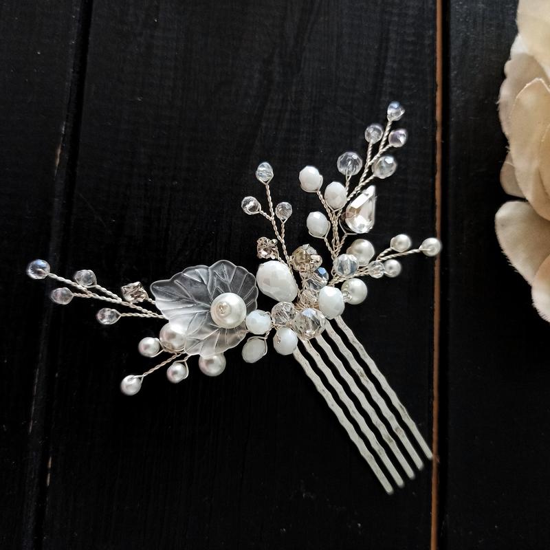 Гребень создан с хрустальных и керамических бусин под жемчуг, страз и посеребренной проволоки.