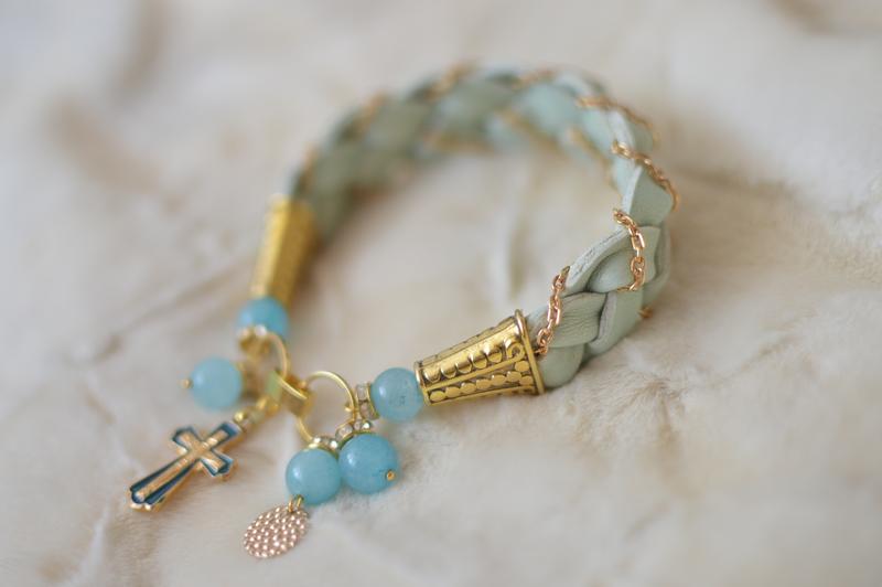 Браслет із натурального необробленого амазоніту. Довжина 22 см. За однією версією, амазоніт отримав свою назву на честь знаменитої річки Амазонки, за іншою версією, назва пов′язана з амазонками – легендарними красунями та воїнками. Амазоніт з давнини був символом жіночої краси та незалежності. Жіночі прикраси з амазоніту знаходять при розкопках скіфських курганів. Носили амазонський камінь і американські індіанці, і стародавні єгиптяни – у гробниці фараона Тутанхамона знайдено безліч амулетів, перстень та намист з амазоніту, оправленого у срібло. Амазоніт можуть носити практично все, астрологічно мінерал пов′язаний з Місяцем і підходить всім знакам зодіаку. Особливо ефективно працює з Терезами, Близнюками та Водоліями. Також великий вплив мінерал надає представників таких знаків зодіаку, як Овен, Рак, Телець, Скорпіон. Камінь допомагає стійко витримувати всі мінливості долі, перемагати конкурентів з бізнесу, ладити з усіма членами сім′ї. Цікаво, що амазоніт підходить не тільки активним та незалежним дівчатам, а й дамам із протилежним характером – спокійним, ніжним та ласкавим, які є традиційними хранительками домашнього вогнища.