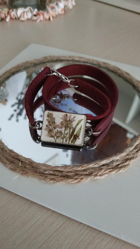 Женский кожаный браслет из мягкой натуральной кожи Crazy Horse в глубоком бордовом оттенке. Приятный на ощупь, хорошо держит форму и красиво смотрится на запястье. Акцент – подвеска с натуральными сухоцветами под прозрачным покрытием. Каждая деталь выглядит живой и немного винтажной, благодаря чему браслет имеет характер и не смотрится масломкетом. Лаконичный, но заметный аксессуар: легко сочетается с повседневными образами, платьем, базовой одеждой в спокойных или теплых тонах. Подойдет и для себя, и в качестве небанального подарка. Характеристики: Материал: натуральная кожа Crazy Horse, металл Цвет: бордовый Длина браслета: 36 см Ширина ремешка: 1 см Размер подвески: 2,6 × 2 см Состояние: идеальный