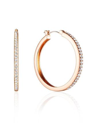 Сережки-кільця з замком-шпилькою. Гвоздик сережки виконаний з гіпоалергенного титанового сплаву. - Прозорі кристали класичної круглої огранювання. - Бижутерный сплав, покриття з натурального рожевого золота. - Діаметр: 4,3 див. - Попелястий агат, лаконічні лінії з покриттям з рожевого золота і розсипом кристалів — в цей вечір ти не залишишся в тіні.