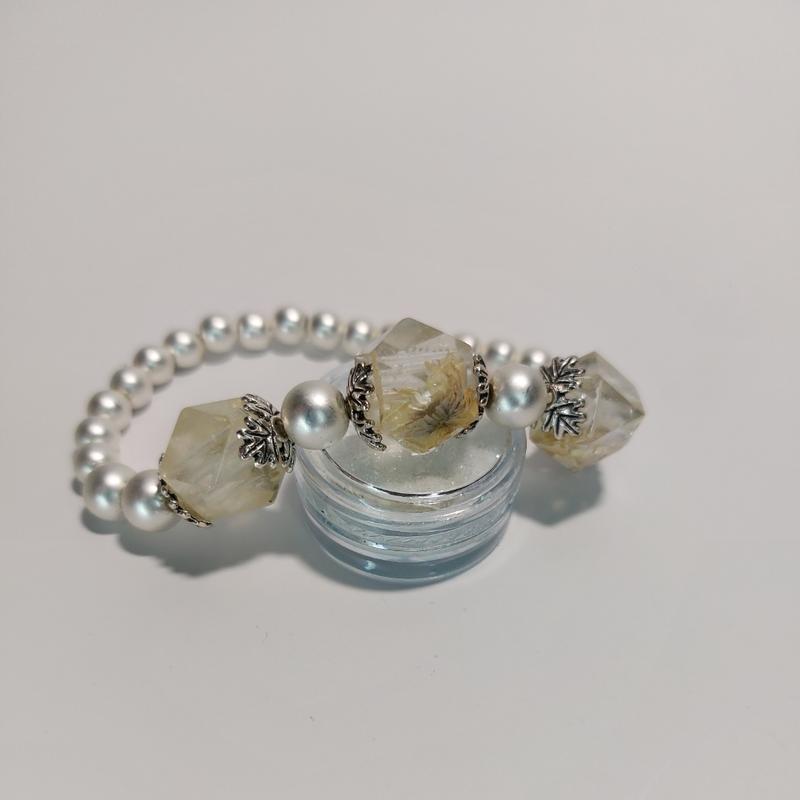Браслет ручної роботи з ювелірної смоли та живих квітів, натуральні бусини (гематіт).