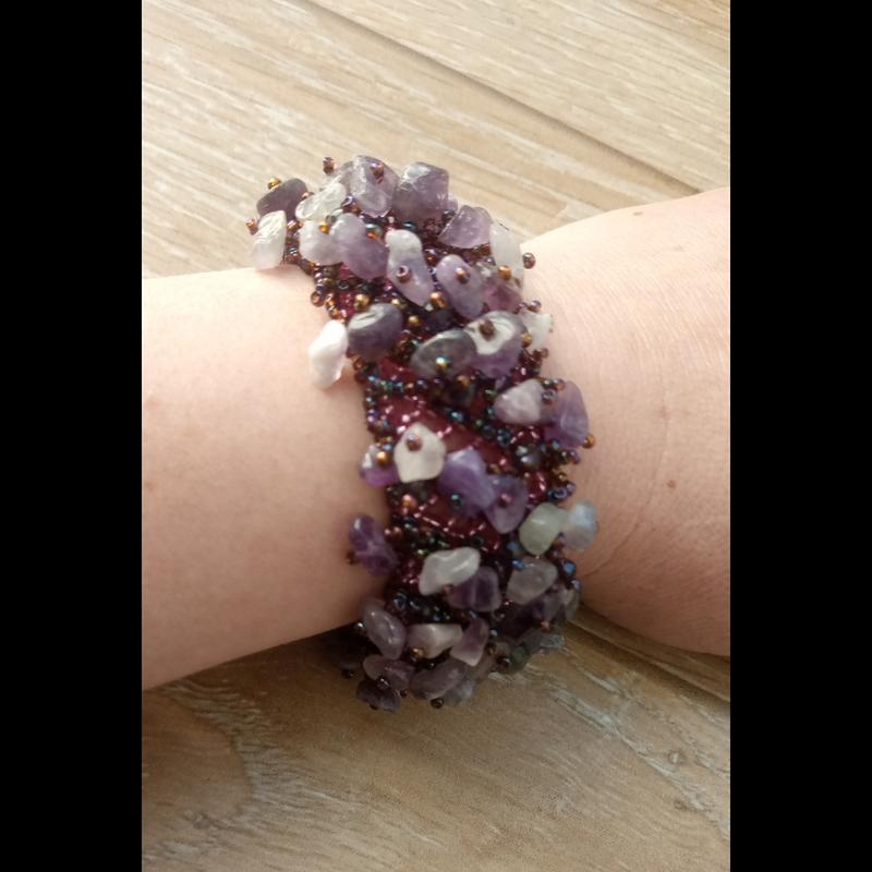 браслет из сколов аметиста и бисера. фурнитура бижутерный сплав без аллергии серебряного цвета. длина 18см+5см удлиняющая цепочка.