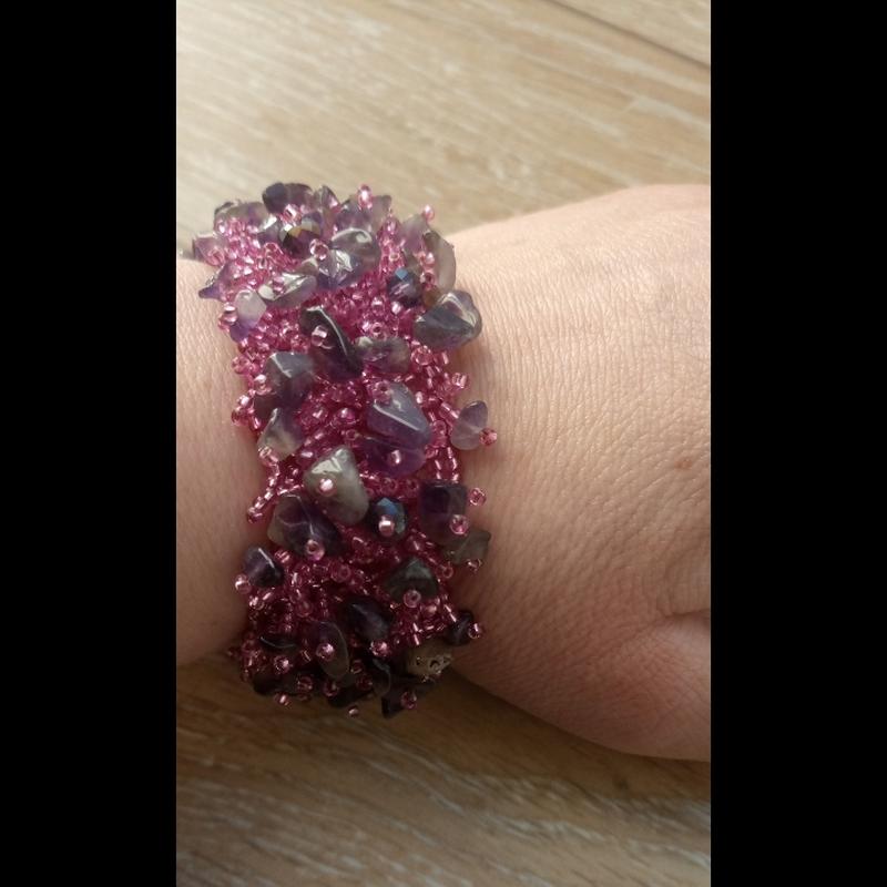 браслет из бисера чешского храсталя и сколов аметиста. фурнитура бижутерный сплав без аллергии серебряного цвета. размер 18см+ удлиняющая цепочка 5см.