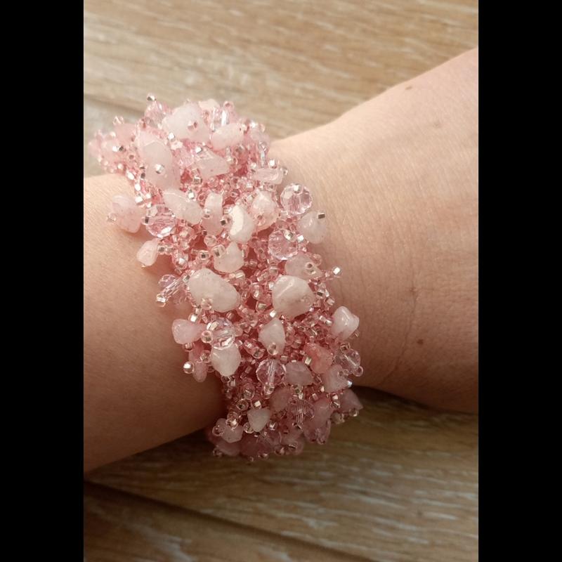 браслет из бисера бусин чешского храсталя и сколов розового кварца. фурнитура бижутерный сплав серебряного цвета. длина17.5см+ 5см удлиняющая цепочка.