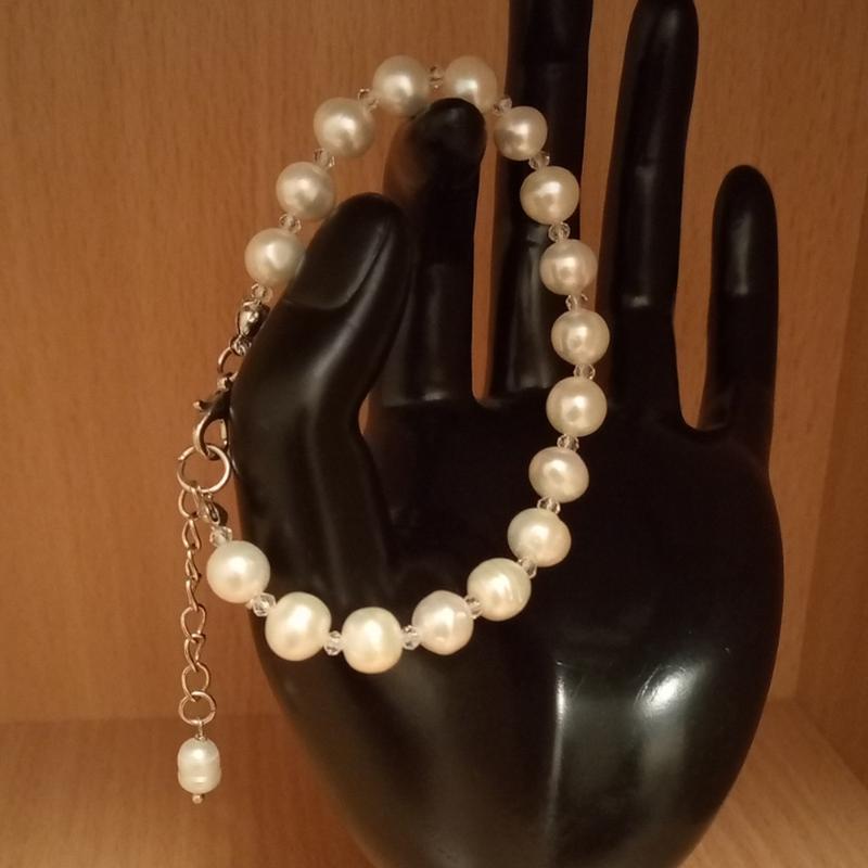 браслет з перлин та намистин чешського хришталю. зроблений на ювелірному тросику. застібка карабін. фурнітура біжутерний сплав срібного кольору. довжина20см+3см подовжуючий ланцюжок.