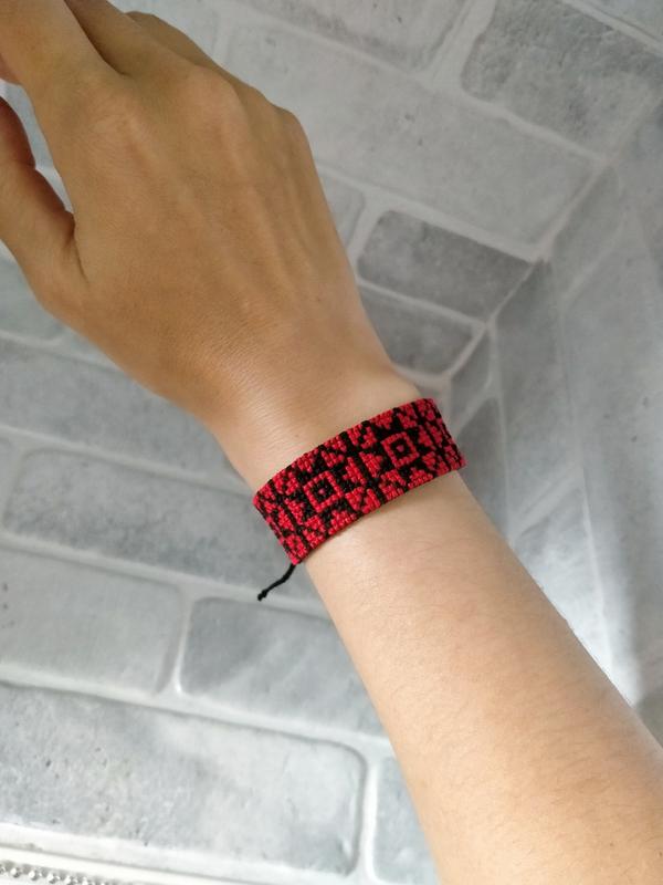 Браслет виготовлений із канви з ручною вишивкою в українському стилі. З внутрішнього боку обшитий натуральною шкірою. Ширина браслету приблизно 2 см. Застібка – зав′язки, сплетені вручну, розмір можна регулювати за допомогою плетеного замочка. За бажанням застібка може бути карабінчик плюс ланцюжок або магнітний замочок (плюс 30 грн до вартості). Розмір на замовлення. Можливе виготовлення на замовлення в іншому кольорі.