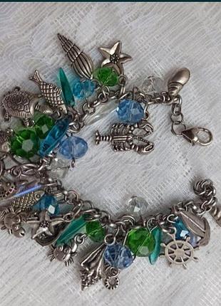 Браслет "Морський настрій", дизайн аксесуара доповнюють підвіски в морському стилі та намистинами прозорого кришталю. Фурнітура — метал кольору — срібло, застібка — карабін.