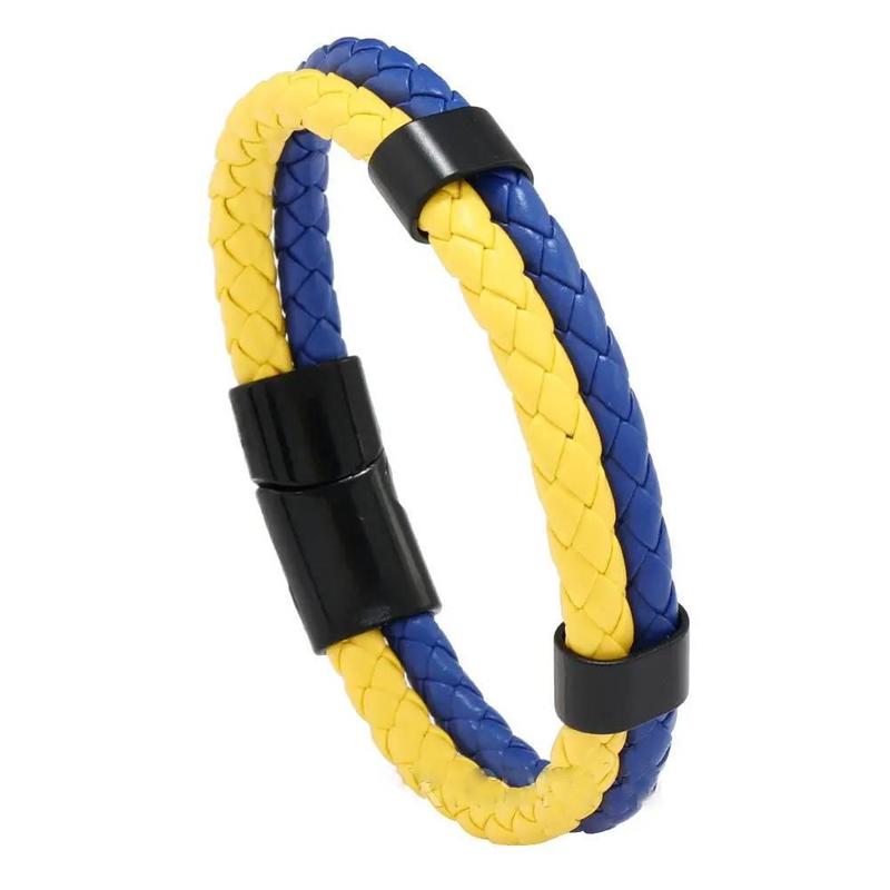 Браслет плетеный на руку патриотический с украинской символикой. Характеристики: Цвет браслета: желто-синий. Цвет металлических вставок и застежки: черный Материал изделия: эко-кожа и нержавеющая сталь. Пол: унисекс. Размер: 21 см Тип застежки: магнитная