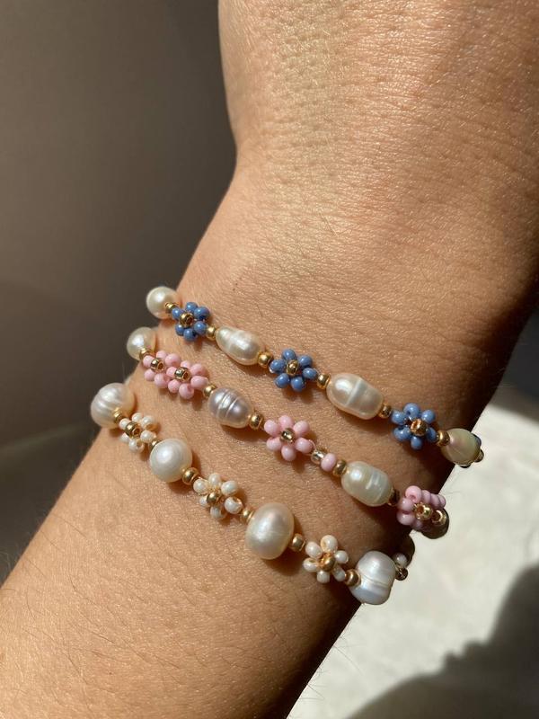 Цветочный браслет из бисера и натурального жемчуга. Качественный чешский и японский бисер, фурнитура lux (золота 24k ) хорошо служит. Браслет делаем на вашу ручку индивидуально, можно добавить удлинитель в защелку. Изготовление 1-3 дня. Цена указана за один браслет