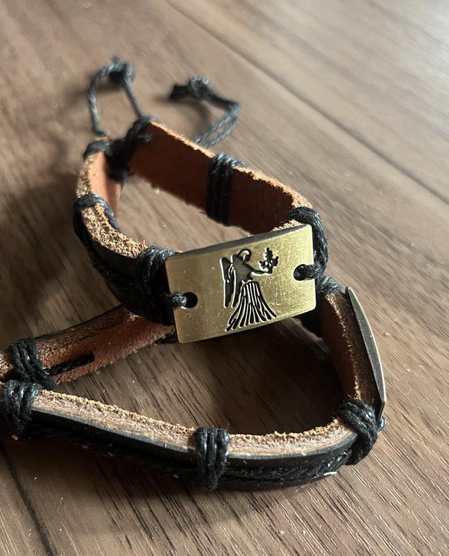 Браслет амулет Знак зодиака - это очень красивый браслет с украшением в виде пластинки с изображением знака зодиака. Браслет состоит из кожаного обода, по обе стороны которого идут 2 жгута. Браслет выглядит очень оригинально. Ремешок регулируется и благодаря этому, подойдет для любого запястья. Не стоит затягивать ремешок, браслет свободно носится на руке. Браслет станет отличным и не дорогим подарком, для друзей, ребенку и т.д. На руке такой браслет смотрится великолепно! Характеристика: - Материал: Кожа, Железо покрытое антикварной бронзой, нить - Знак зодиака: Дева - Вес: 41 грамм