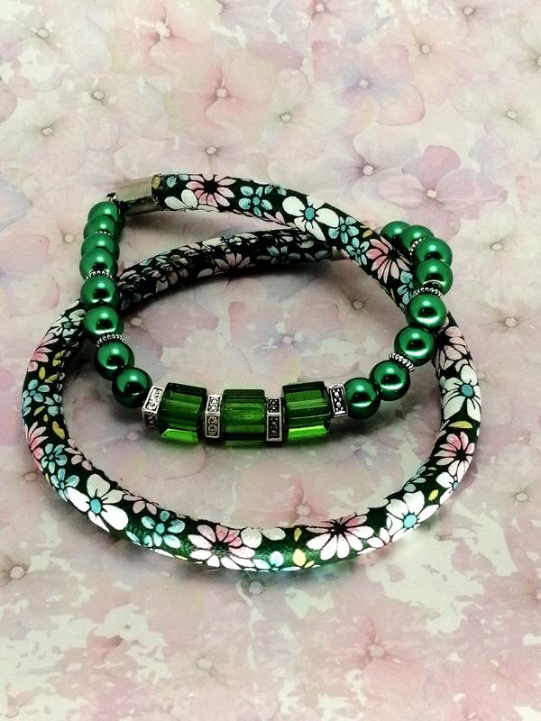 Браслет з шкірозамінника і скляних намистин з металевими вставками.