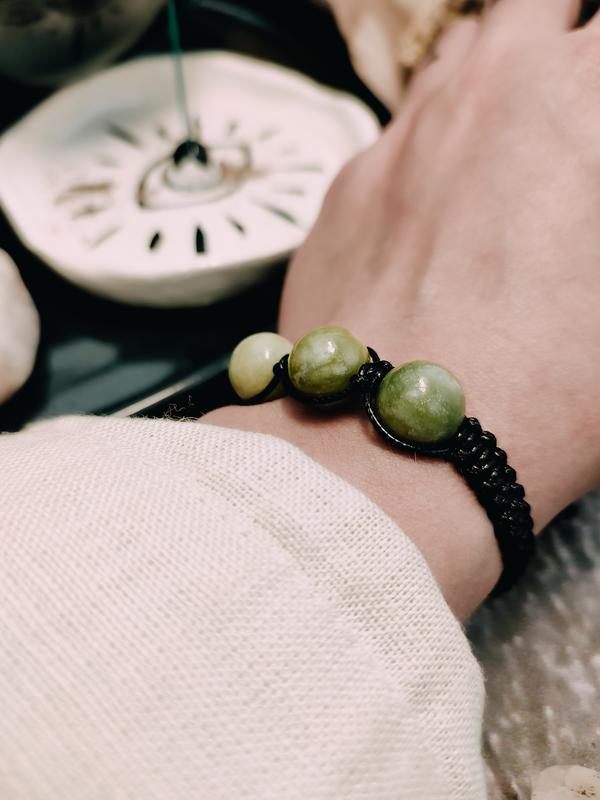 Ручна робота Регульована довжина Діаметр каменю 12 мм Вощений водостійкий шнур (можна мочити прикрасу) Натуральні камені Плетений зелений браслет з натурального каменю нефрит - лаконічний еко аксесуар та елемент для енергетичної взаємодії з мінералом. Браслет виконаний зі зносостійкого шнура в класичному плетінні шамбала, регулюється за об'ємом. Виглядає стримано та мінімалістично, підходить для повсякденного носіння під різний одяг. Зелений колір символізує глибинний зв'язок з природою, сприяє підсиленню чакри Анахата, яка відповідає за почуття гармонії, любові до себе та оточуючих, пов'язана з сердцево-судинною системою та органами дихання. Нефриту приписують наступні властивості: посилення внутрішньої гармонії; камінь транслює бадьорість, дарує натхнення, віру у власні сили; посилення концентрації уваги на важливих життєвих аспектах та під час медитації; допомагає в подоланні труднощів; виховує вольові якості; сприяє позитивним змінам.