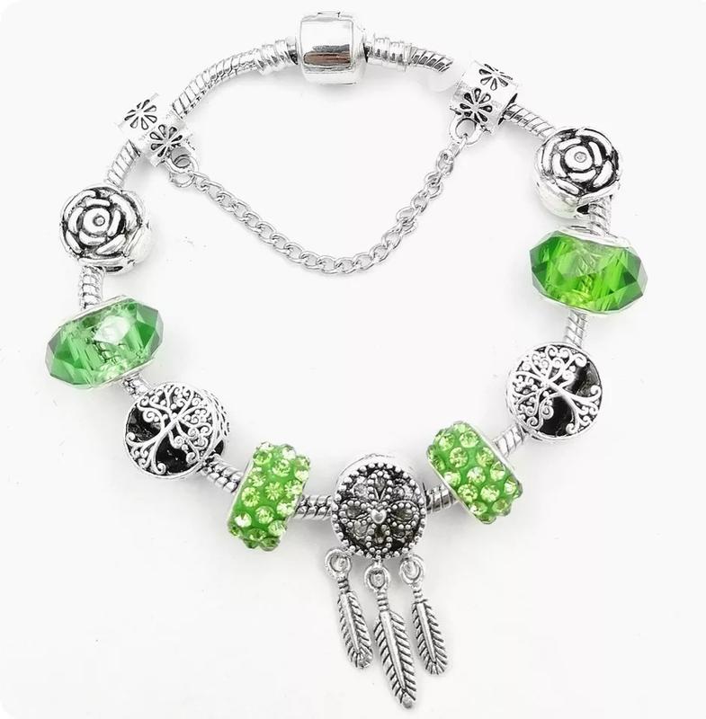 Cтильный женский браслет в стиле PANDORA идеально подойдет как для молодой девушки, так и для уверенной в себе бизнес-леди. Модный аксессуар состоит из 11 шармов: 2 из которых изготовлены из стекла зеленого цвета, 5 посеребренных шарм, 2 слоя со стразами и 2 бусины соединены цепочкой. Подвески на браслете перемещаются свободно и вращаются с движением вашего запястья, создавая завораживающий эффект и подчеркивая утонченную красоту точеной ручки. Все шармы съемные, поэтому можно самим создать уникальное, эксклюзивное украшение. Зеленый – это цвет, который вызывает ассоциацию с природой, деревьями, луками, весной. Это успокаивающий, освежающий, а иногда даже бодрящий цвет, который придает богемному оттенку вашему образу. Он часто ассоциируется с надеждаю, удачей и защитой. Поэтому зеленый браслет в стиле Пандора – настоящий талисман для 150-ти вековых.