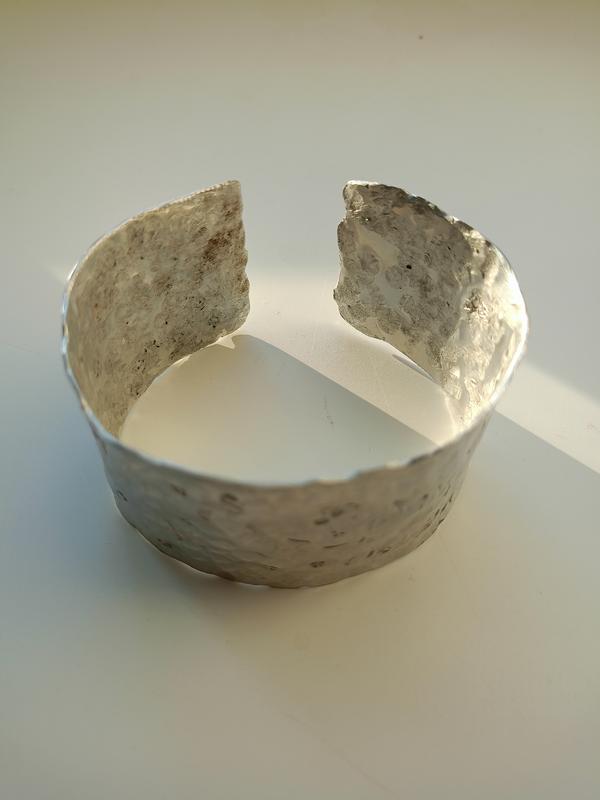 Широкий "мятый" браслет светло-серебристого цвета. Можно подогнуть на любое запястье, но лучше будет сидеть на среднем или широком. Высота браслета: 4 см